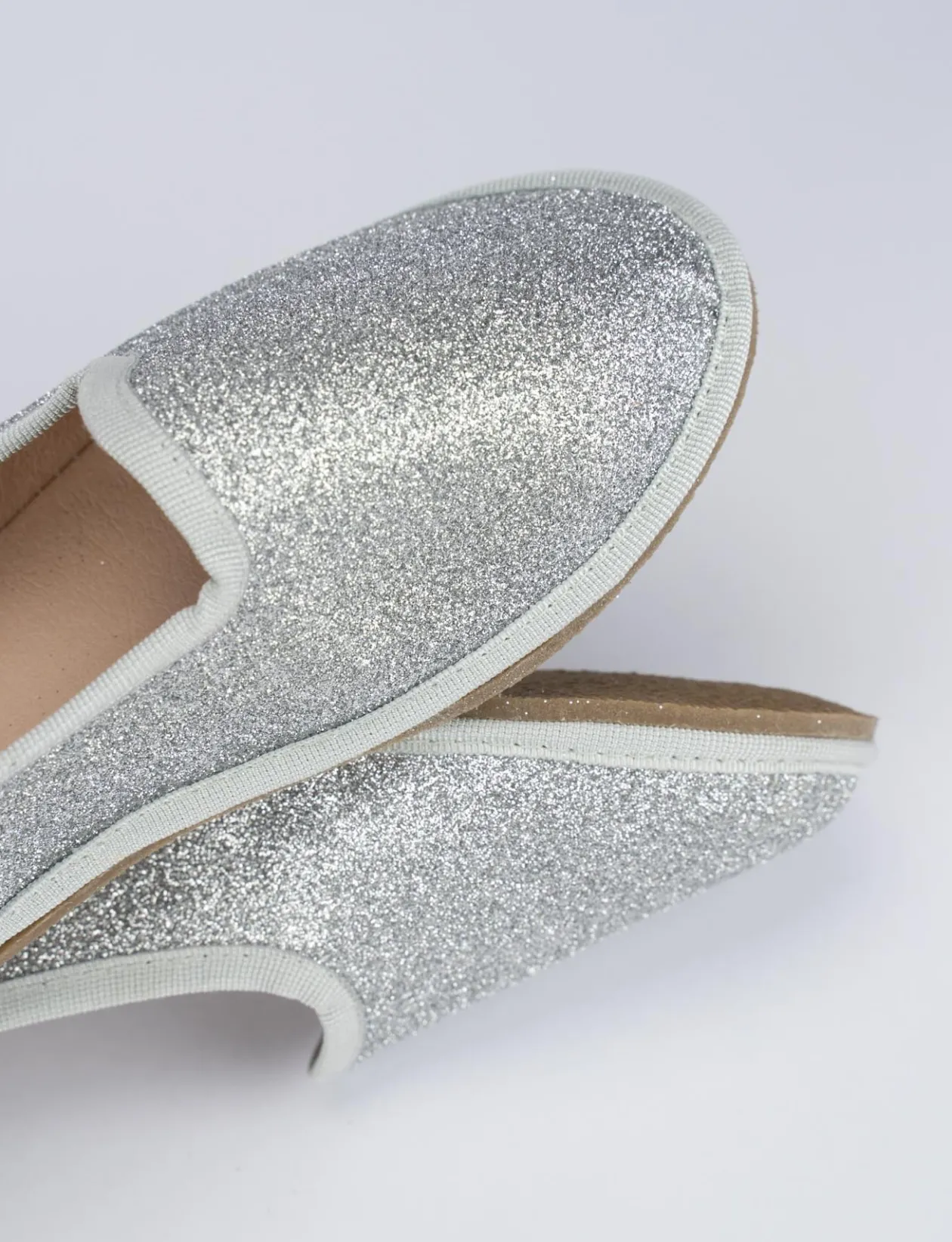 Ballerina tacco 1 cm, fondo cuoio e soletto interno in vera pelle. Tomaia in finissimo tessuto glitterato con particolare lavorazione a babbuccia per un look adatto a tutte le tue occasioni.