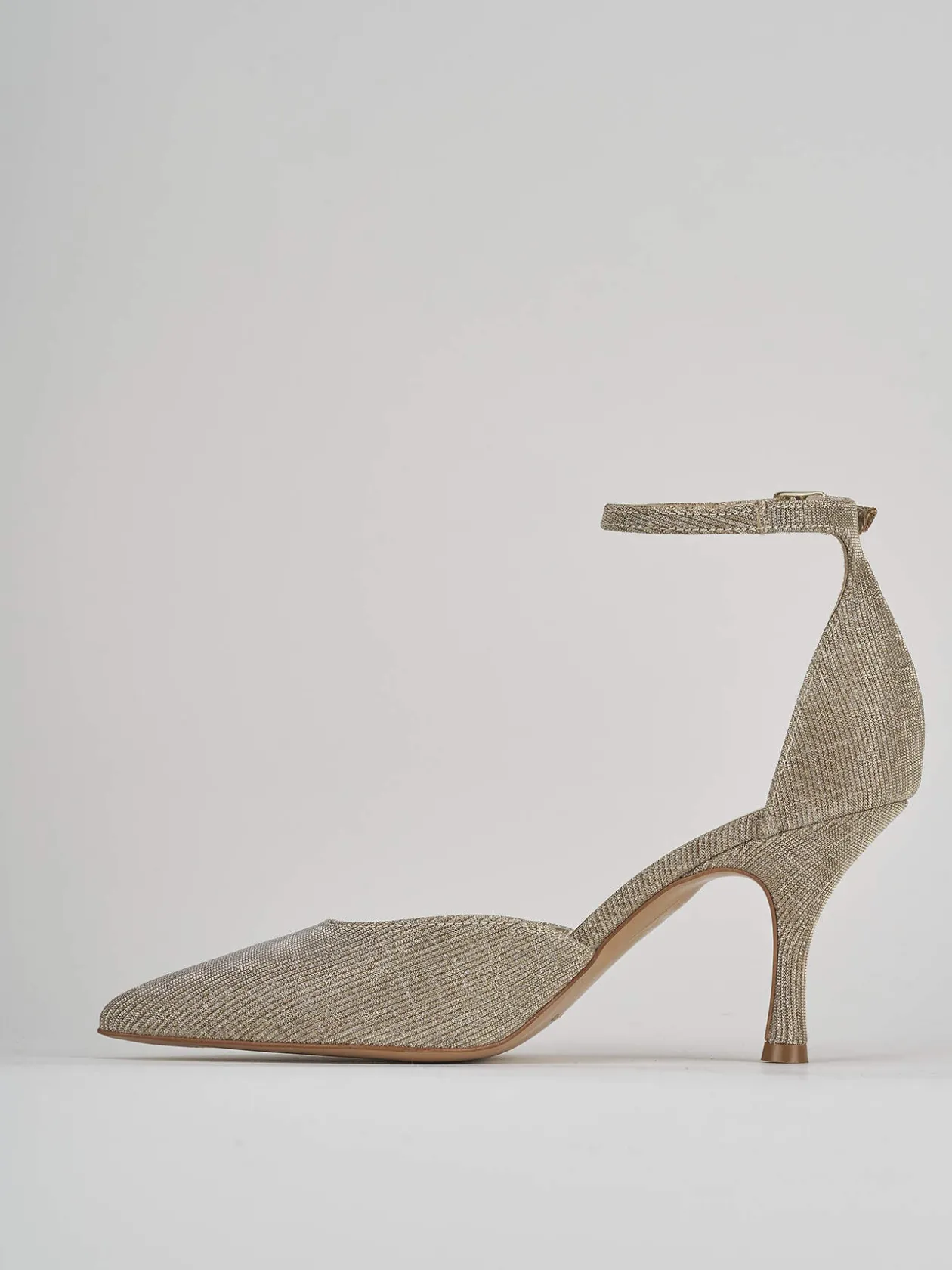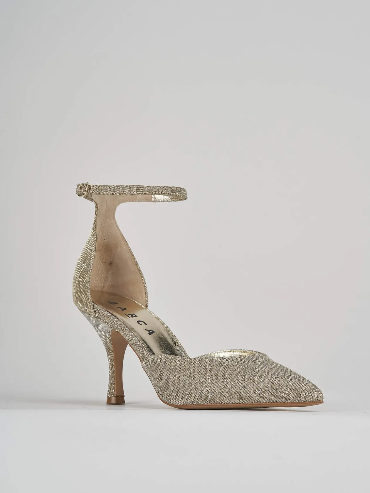 Bebè tacco 7 cm, fondo in cuoio e soletto interno in vera pelle.Tomaia in morbida pelle foderata di un nuovissimao materiale glitterato fine, punta sfilata, tacco fino e chiusura con fibbia regolabile, giuste con un vestito o una gonna per un look super cool.