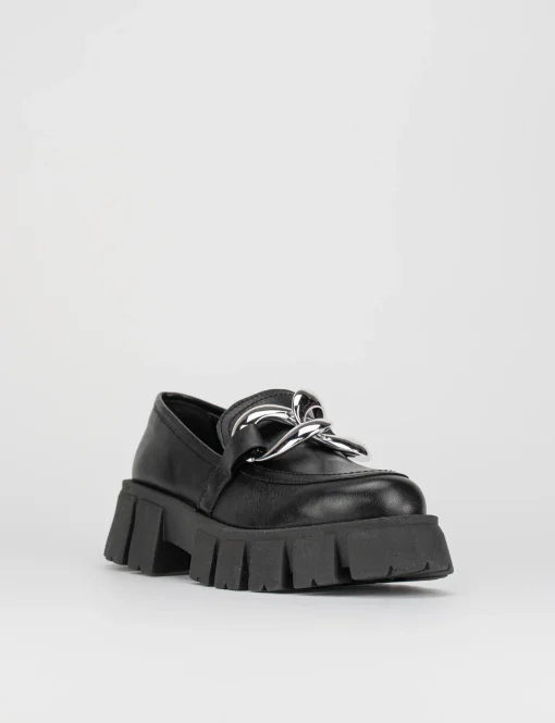 Mocassino tacco 1cm, fondo gomma alto extralight e soletto interno in vera pelle. Tomaia in morbida nappa, nuovissimo accessorio con catenona argento e particolare fondo carrarmato alto 3cm must di stagione.