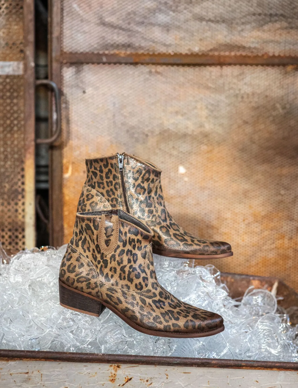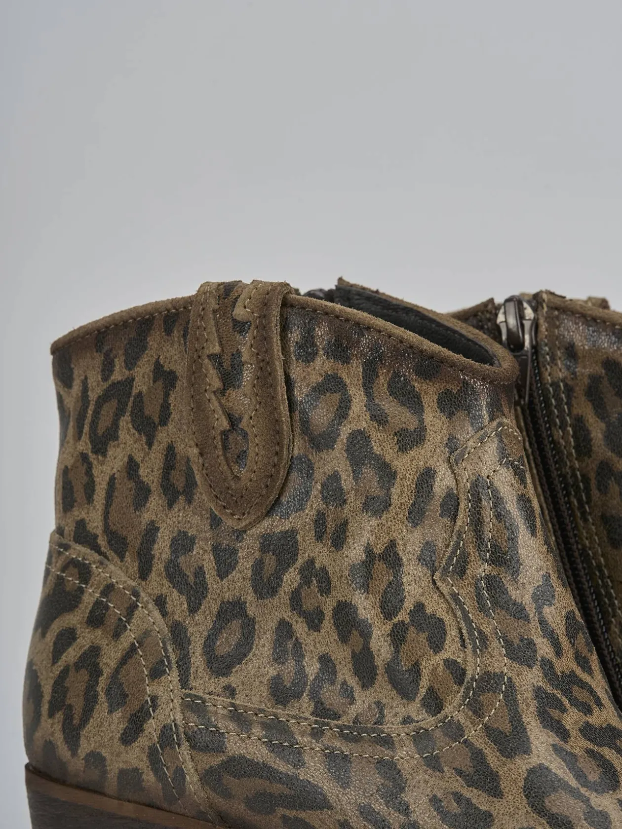 Stivaletto texano tacco 3 cm fondo in gomma e soletto interno in vera pelle. Tomaia in morbido camoscio con stampa leopardo, punta sfilata, cuciture visibili, cerniera laterale e ghetta a lato. tacco stabile per il look texano perfetto.
