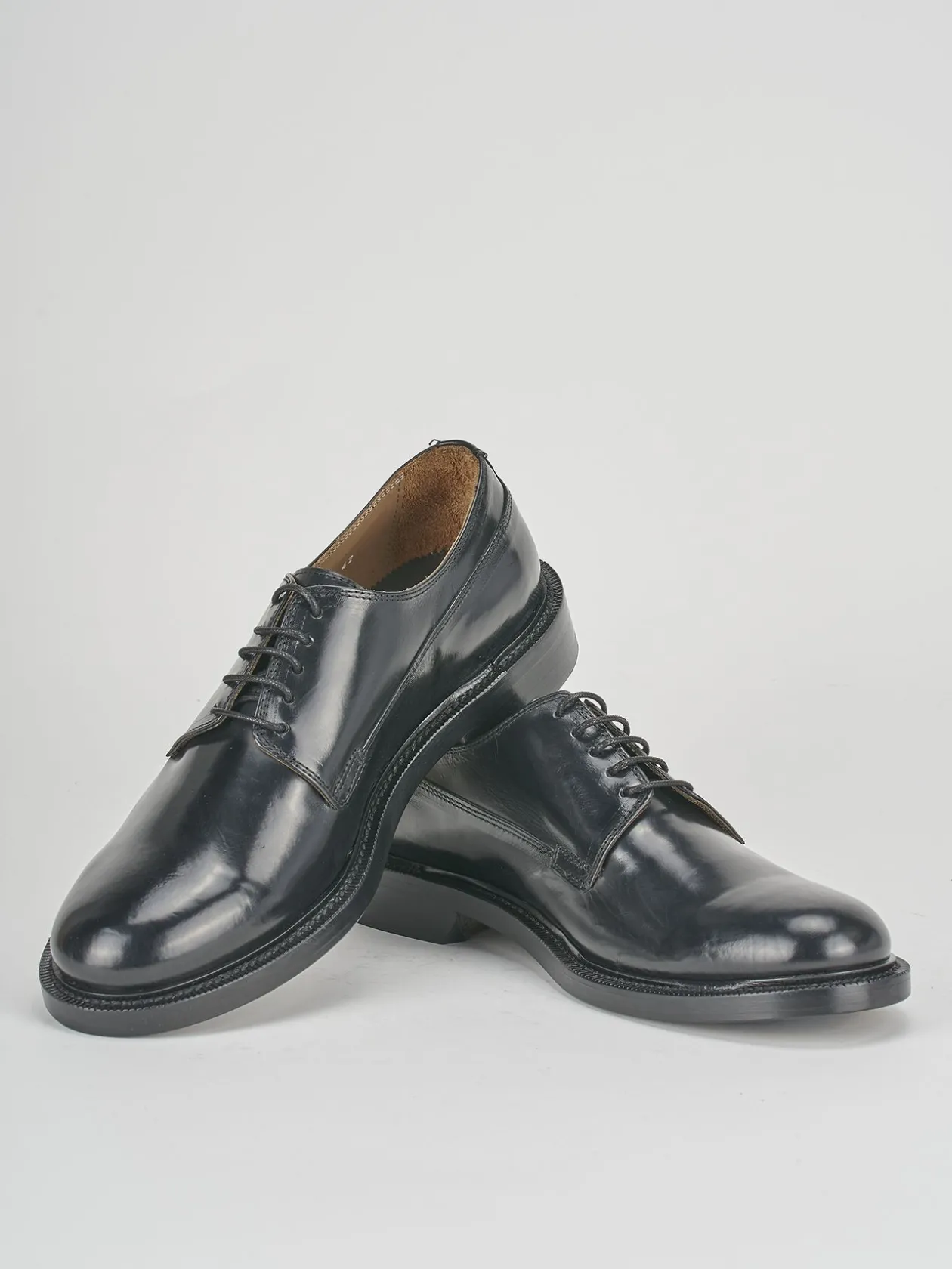 stringata fondo in cuoio con punta in gomma e soletto interno in vera pelle. tomaia in morbida pelle, francesina, puntale, cuciture handmade.