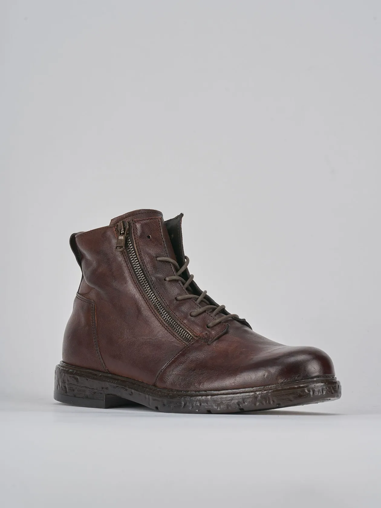 Anfibio fondo in gomma e soletto interno in vera pelle. Tomaia in morbida pelle, punta tonda, cuciture visibili, lace e zip per un look sporty-chic.