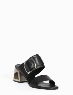 ciabatta tacco 6 cm, fondo in gomma e soletto interno in vera pelle. Tomaia in morbidissima pelle nappata a due fasce, di cui una abbellita da una bellissima fibbia. Particolarissimo tacco sagomato in acciaio.