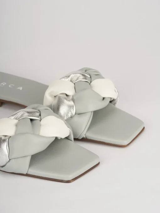 ciabatta tacco 1 cm fondo cuoio e soletto interno in vera pelle. tomaia in morbida pelle,punta squadrata, fascia unica intrecciata con colori abbinati per un look casual chic.