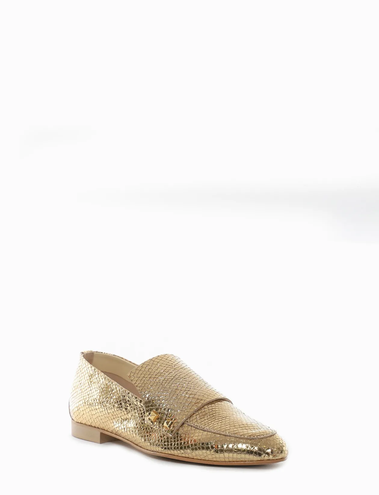 Mocassino tacco 1 cm, fondo cuoio e soletto interno in vera pelle. Tomaia in morbida pelle pitonata con particolarissima mascherina e due borchie laterali per un look grintoso.