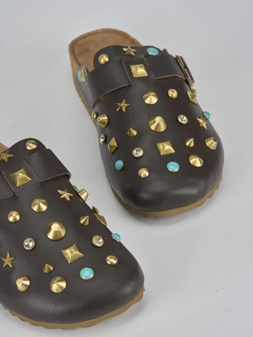 Sabot tacco 1 cm fondo in leggerissima gomma e soletto interno in vera pelle. Tomaia in morbida pelle, punta affusolata, fascia, borchie multicolor per un tocco rock ai tuoi look.