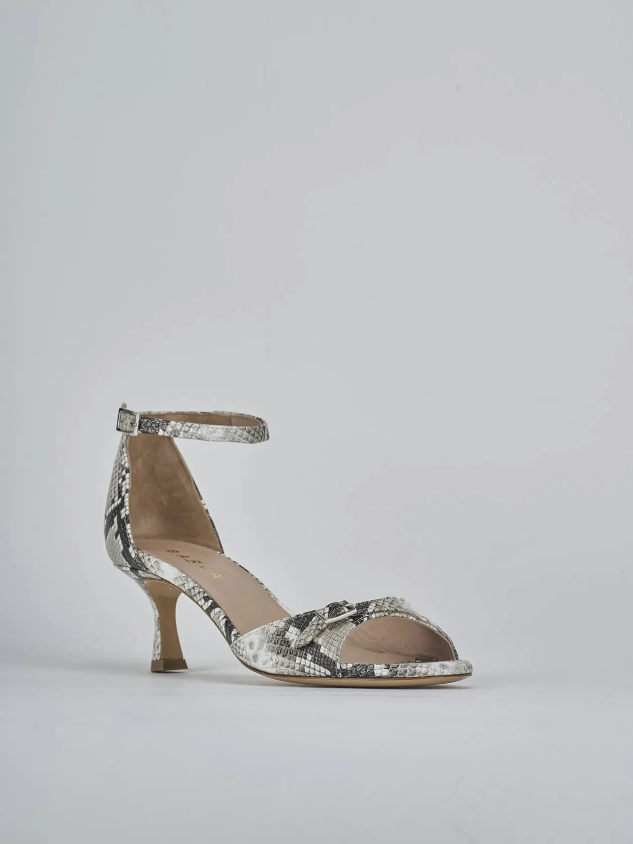 Sandalo tacco 5 cm fondo in cuoio e soletto interno in vera pelle. Tomaia in morbida pelle stampata effetto pitotanto, punta affusolata, fascia unica con taglio svasato e cinturino con fibbia regolabile, cinturino in caviglia e tacco rocchetto. Perfetto per l’ufficio ma anche per le occasioni speciali.