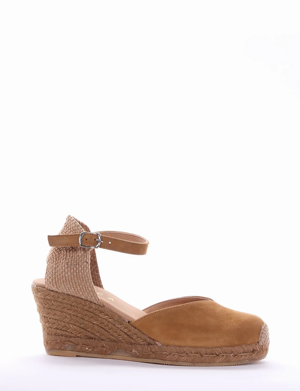 sandalo espadrilas zeppa 6 cm, fondo in gomma e soletto interno in vera pelle. Tomaia in morbidissimo camoscio punta chiusa e tallone in tessuto chiuso da un cinturino in caviglia.