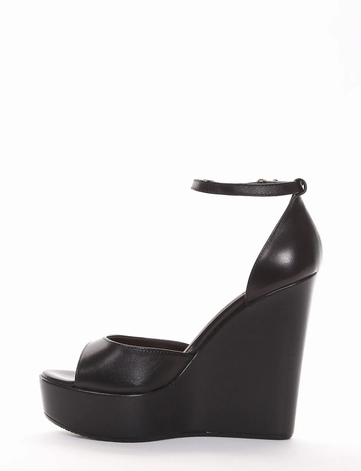 sandalo zeppa 13 cm, fondo in gomma e soletto interno in vera pelle. Tomaia in morbida pelle a fascia unica con tallone chiuso e cinturino sottile in caviglia. Zeppa interamente foderata in pelle con plato alto 3cm nella parte anteriore.