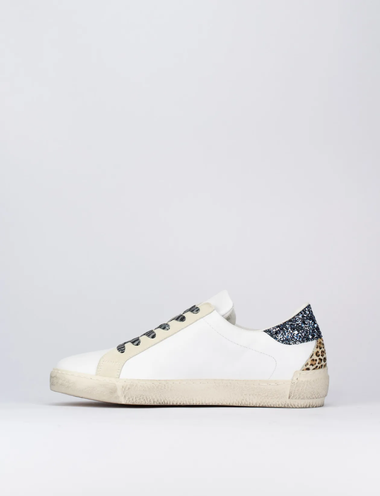 Sneaker fondo gomma e soletto interno in vera pelle. Tomaia in morbida nappa, particolari toppine posteriori in glietter e cavallino. So cool!