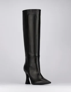 stivale tacco 9 cm, fondo cuoio e soletto interno in vera pelle. tomaia in morbida pelle, punta sfilata, gambale a tubo e altezza appena sotto il ginocchio. So chic!