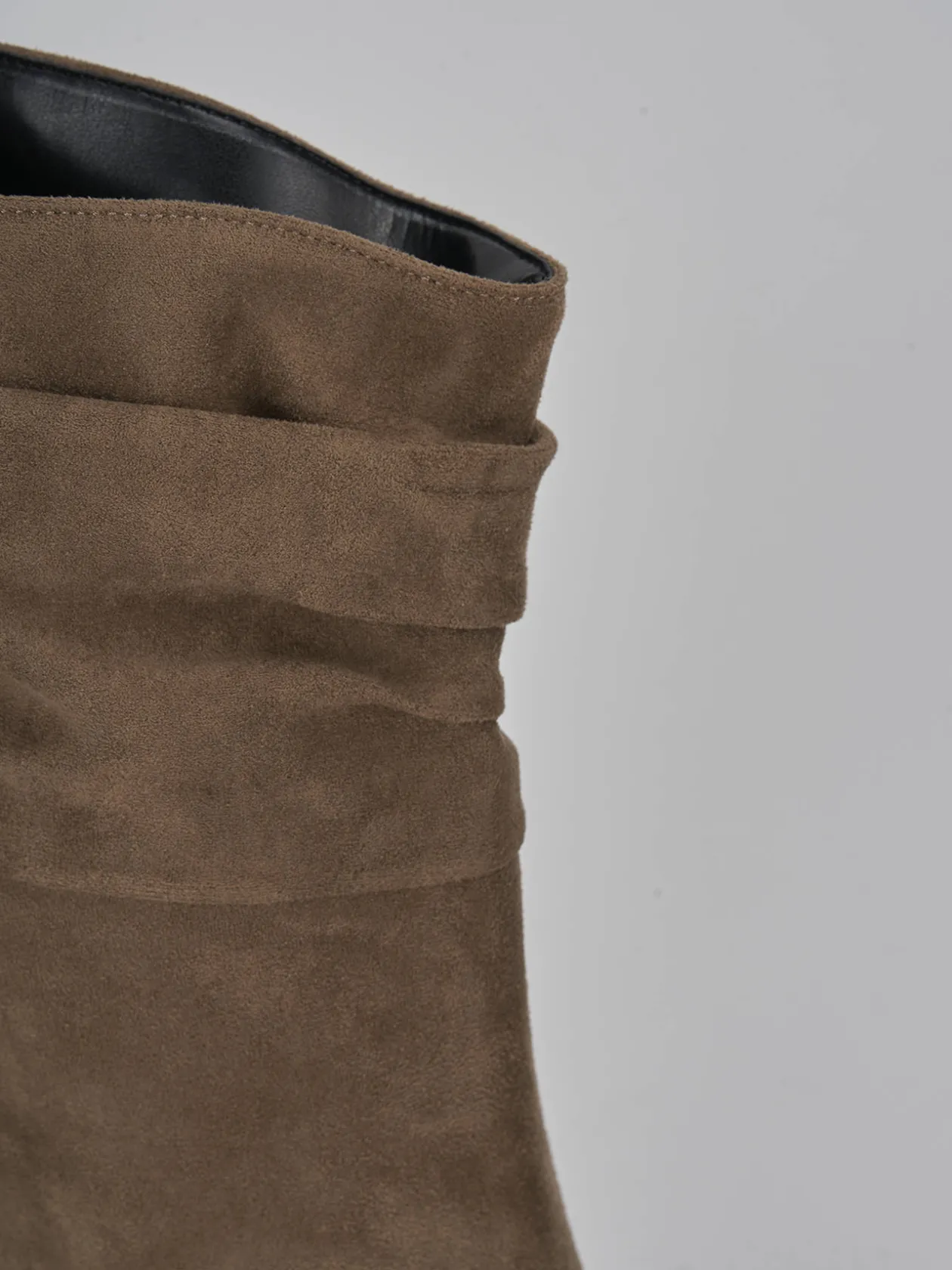 stivaletto tacco 9 cm fondo in gomma e soletto interno in vera pelle. Tomaia in morbido camoscio, punta sfilata e gambale arricciato che misura a metà polpaccio. tacco fino per un look chic.