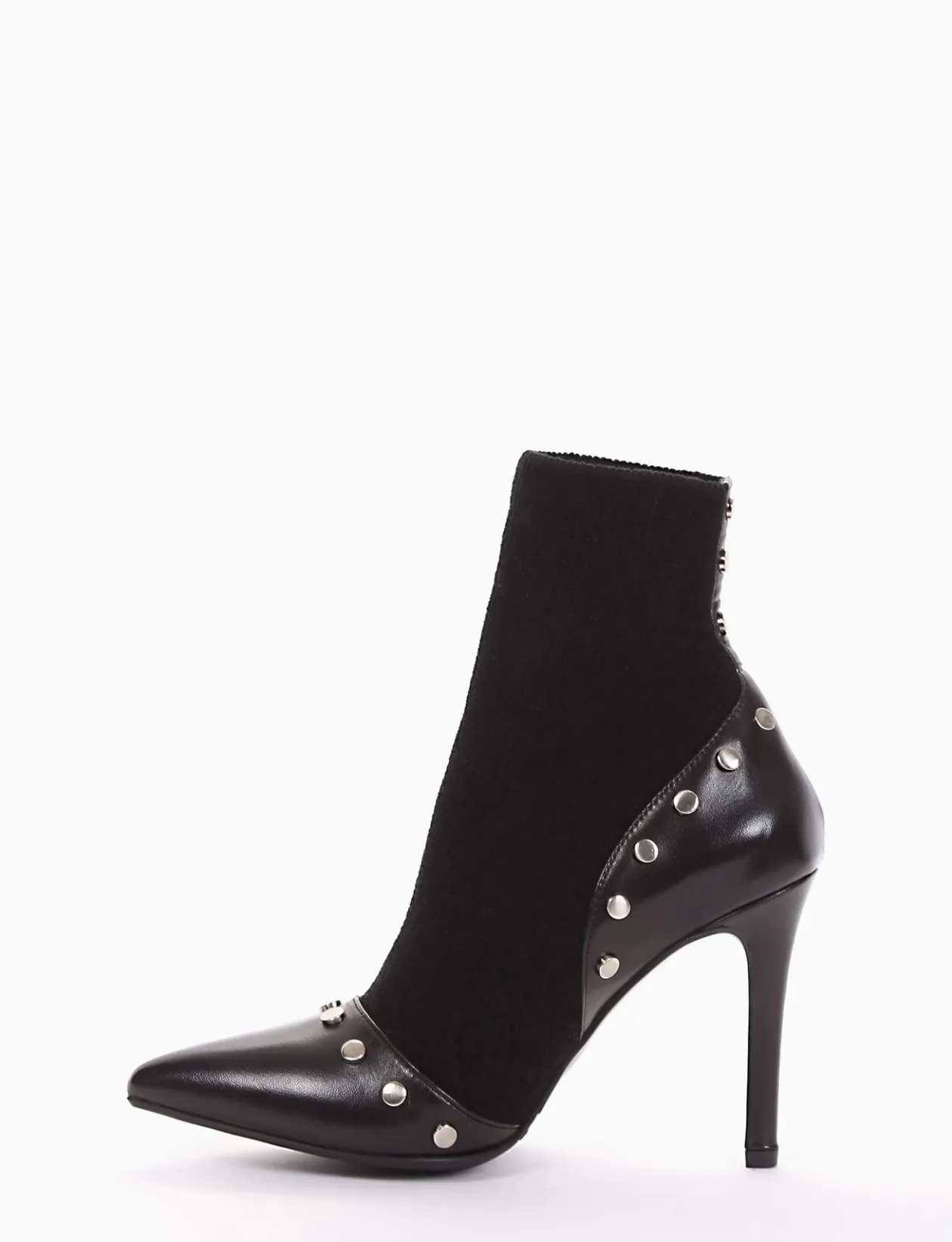 stivaletto tronchetto tacco 10 cm, fondo in gomma leggera e soletto interno in vera pelle. Tomaia in morbidissima pelle nappata fatta a calzino sul gambale. Nuovissime borchiette sul puntale e sul tallone.