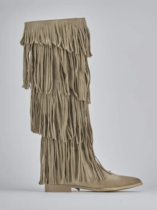 Stivale tacco 2 cm fondo in gomma e soletto interno in vera pelle. Tomaia in morbido camoscio, punta sfilata, frange su entrambi i lati del gambale che misura appena sotto il ginocchio. Perfetto con una minigonna e una maglia.