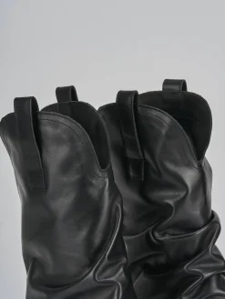 Stivale texano tacco 5 cm fondo in gomma e soletto interno in vera pelle. Tomaia in morbida pelle, punta sfilata, gambale arricciato con risvolto che misura a 3/4 del polpaccio e apertura frontale a ‘U’. Ghette che mantegono la forma e guardolo sporgente per un look cool.